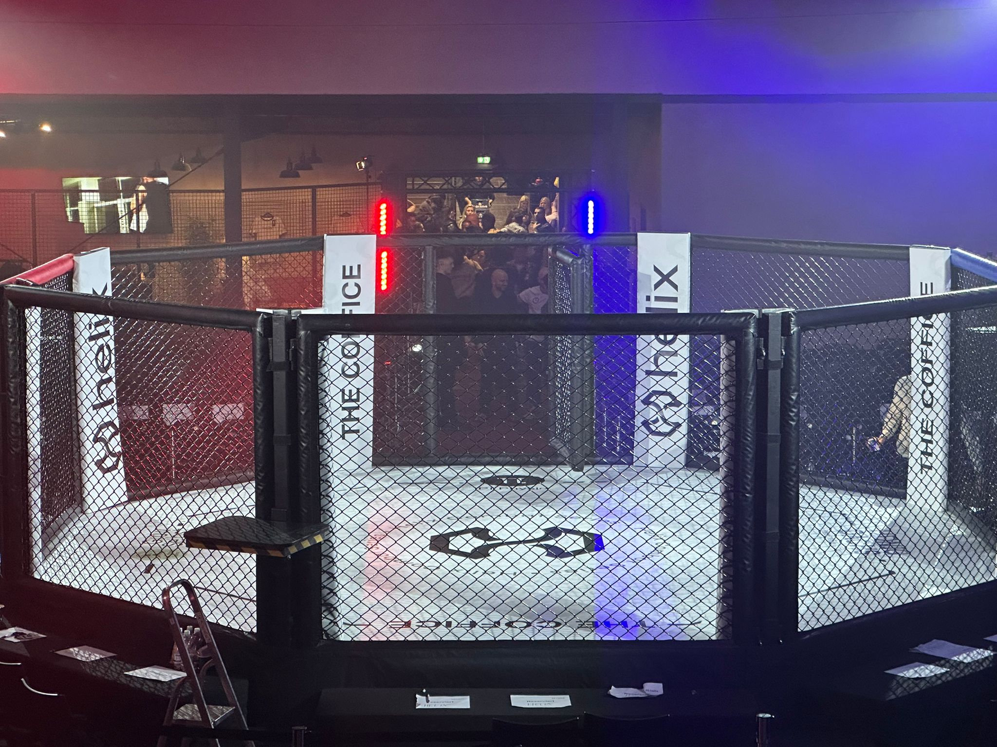 Aus diesem Grund bieten wir unseren Mitgliedern und Förderern an, den vereinseigenen 6,5m MMA-Eventcage mit 0,9m hoher Plattform und zwei TV-Podesten zu günstigen Konditionen auszuleihen.